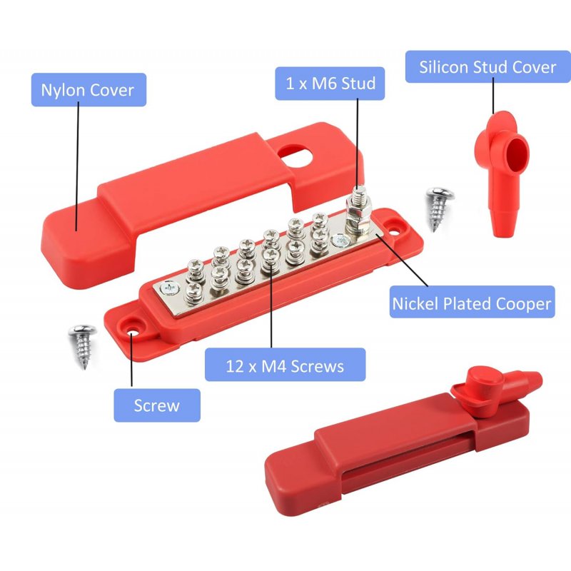 - Удобная компоновка: Блок имеет 1 главную силовую шпильку 1/4" (М6) для подключения к аккумулятору и 12 винтовых клемм М4 для разводки на потребители.
