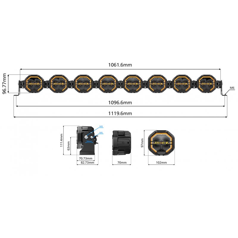 Модульные светодиодные фары Aurora ALO-W-4-R12T3-AW-D8 (8 шт, 320 Вт, 32000 Лм, DRL белый/янтарный, IP69K)