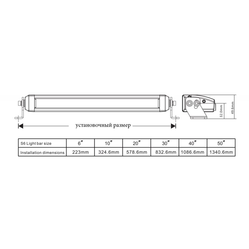 Фара выполнена в ультратонком однорядном корпусе длиной 6 дюймов, что делает её удобной для монтажа в ограниченном пространстве - на бампер, решётку радиатора, экспедиционный багажник или в нишу.