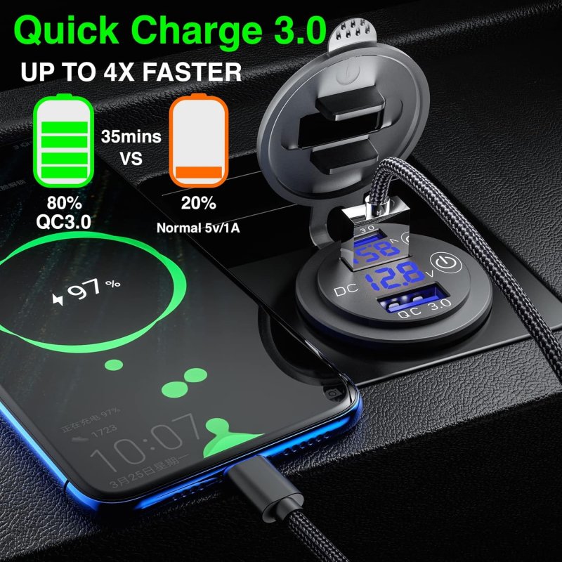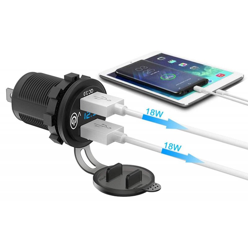 Универсальная двойная USB-розетка с поддержкой быстрой зарядки QC 3.0, общей мощностью 36 Вт (по 18 Вт на каждый порт) — идеальное решение для автомобилей, мотоциклов, квадроциклов, катеров и любой техники с напряжением DC 12–24 В. Благодаря умному встроенному IC-чипу устройство автоматически определяет подключённый девайс и подбирает оптимальную скорость зарядки, обеспечивая диапазоны 5–6.5 В / 3A, 6.5–9 В / 2A и 9–12 В / 1.5A.