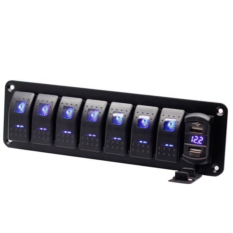 Многофункциональная панель управления, объединяющая в одном корпусе 7 клавишных переключателей, мощное двойное USB-зарядное устройство и цифровой вольтметр. Основа панели выполнена из усиленного алюминия, что обеспечивает высокую механическую прочность и долговечность по сравнению с пластиковыми аналогами. Устройство предназначено для централизованного управления электрическими цепями (свет, лебедка, насосы и т.д.), зарядки гаджетов и мониторинга состояния бортовой сети.