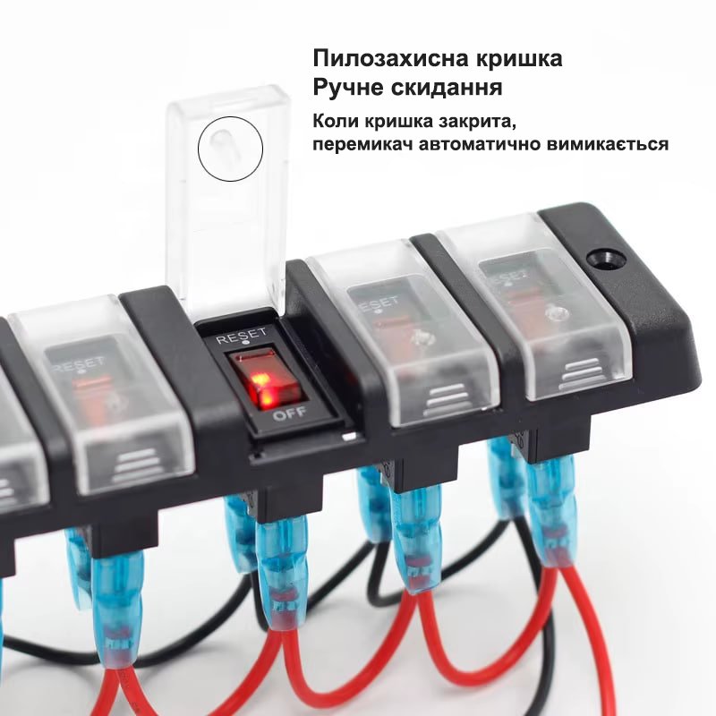 Главной особенностью данной модели является наличие встроенной защиты (автоматических выключателей) для каждой цепи, что делает ее идеальным решением для управления дополнительным светом, насосами и другими приборами на внедорожниках, спецтехнике и водном транспорте.