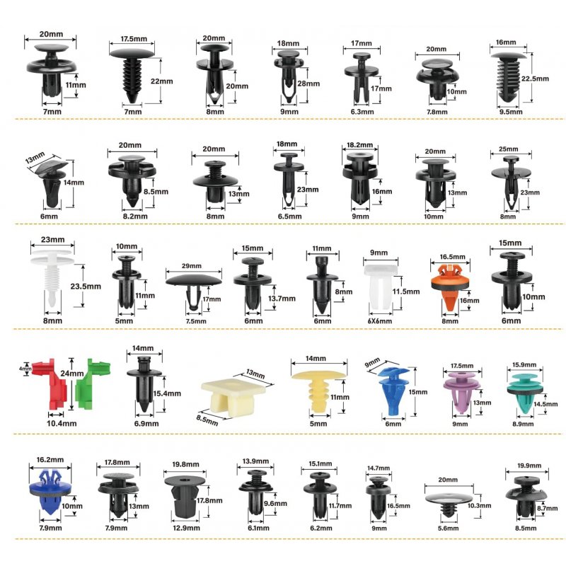 - Економія часу та грошей: Купівля великого набору значно вигідніша, ніж придбання кліпсів поштучно в магазинах запчастин. У вас під рукою завжди буде потрібний розмір кріплення для будь-яких завдань.
